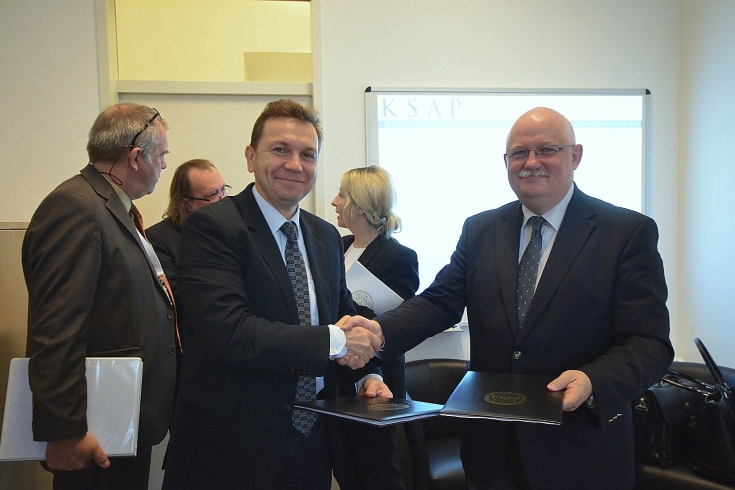 Pan Norbert Kis, vice-rector NUPS i Jan Pastwa Dyrektor KSAP podają sobie ręce po podpisaniu porozumienia