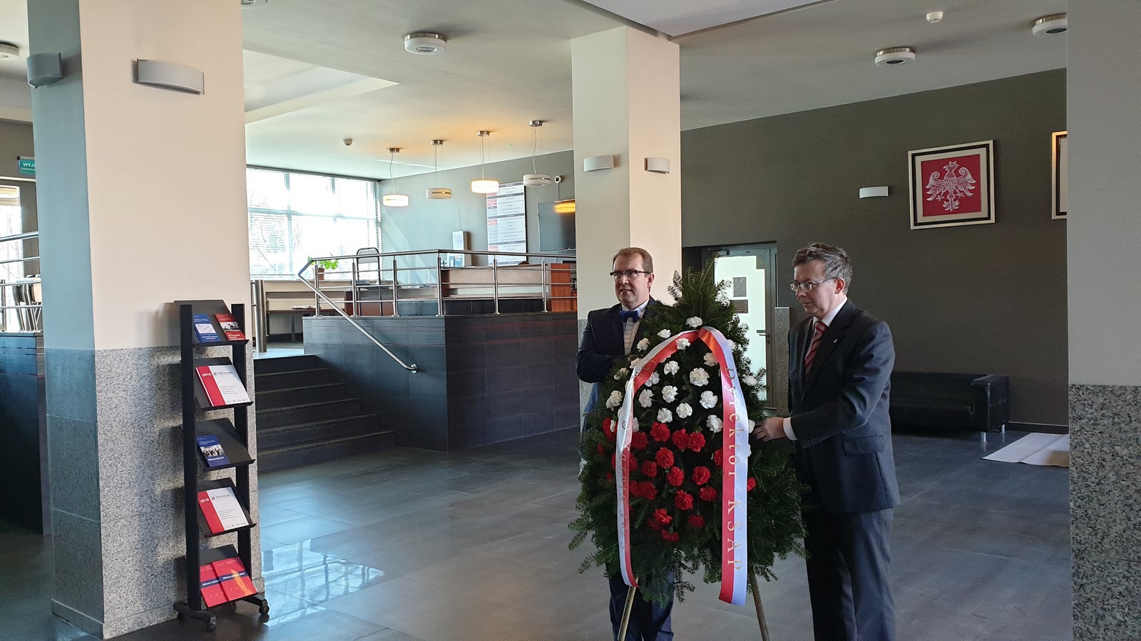 Dyrektor Krajowej Szkoły Administracji Publicznej – dr. Wojciech Federczyk oraz Szef Służby Cywilnej – Dobrosław Dowiat-Urbański uroczyście oddali hołd poległym w katastrofie składając kwiaty pod tablicą upamiętniającą Patrona Szkoły ś.p. Prezydenta Rzeczypospolitej Polskiej Lecha Kaczyńskiego oraz Absolwenta I Promocji KSAP śp. Władysława Stasiaka.