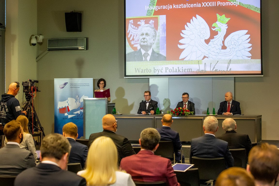 Słuchacze XXXIII Promocji złożyli uroczyste ślubowanie: „Pragnąc służyć Rzeczypospolitej Polskiej, ślubuję sumiennie i rzetelnie wypełniać obowiązki słuchacza Krajowej Szkoły Administracji Publicznej imienia Prezydenta Rzeczypospolitej Lecha Kaczyńskiego, postępować zgodnie z zasadami etyki, a swoją postawą dawać świadectwo poszanowania prawa i godności innych.”