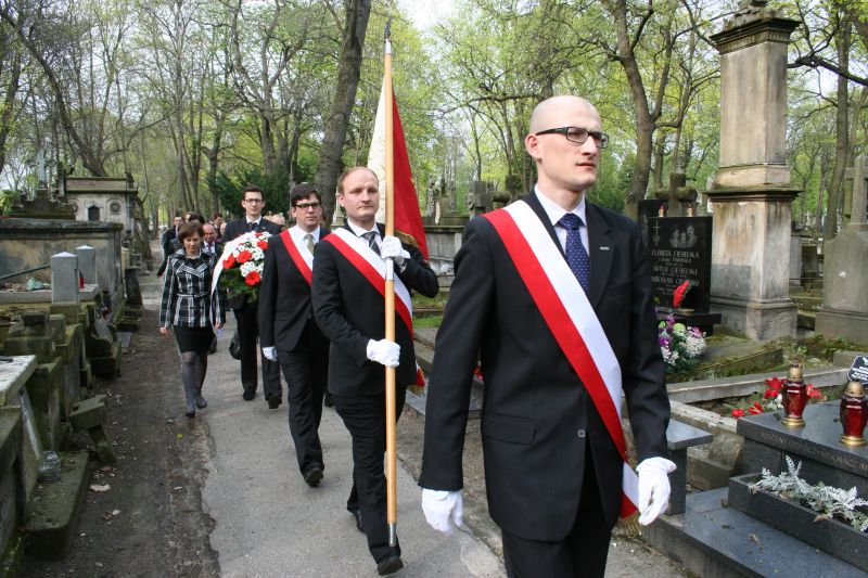 Członkowie Pocztu Sztandarowego Krajowej Szkoły Administracji Publicznej w obecności Dyrektora Marka Haliniaka oraz pracowników Szkoły przeszli przez cmentarz „Stare Powązki” i złożyli kwiaty oraz zapalili znicze na grobie Patrona.